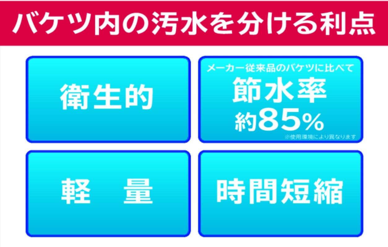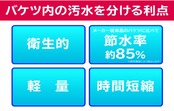 さらにメーカー従来品と比べ、少ない水でモップパッドを洗えるので節水性に優れ、水を入れてもバケツが重くなりにくいので、女性でも楽に持ち運びができます。