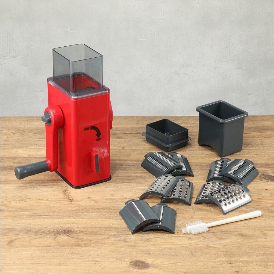 ・本体(ドラムローラー、ハンドル付)、スライサープレート×5種類(平切り刃、太千切り刃、細千切り刃、砕く刃、おろし刃 各2)、安全ホルダー(プレート収納ケース)、蓋、メンテナンスブラシ